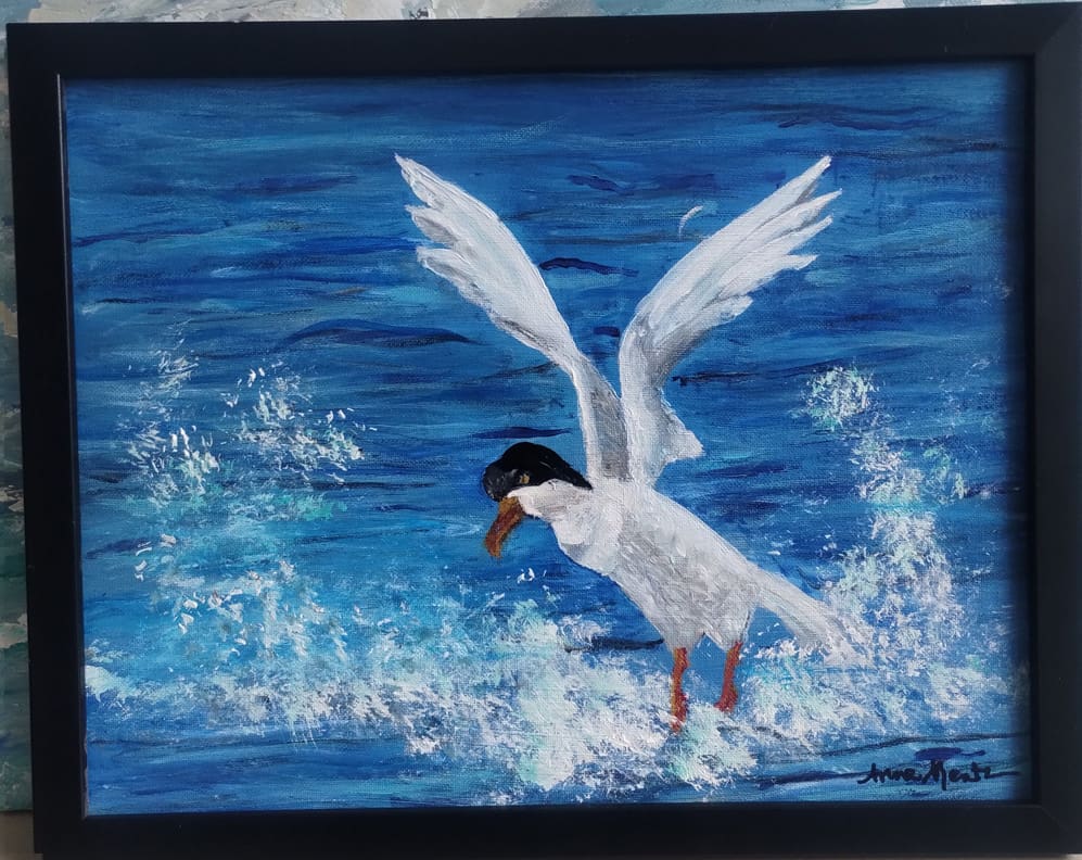 This 11 x 14″ piece of wall art depicts a black and white sea bird coming in for a splashy landing on the water. It is done in acrylic paint on canvas and set in a black wooden frame.